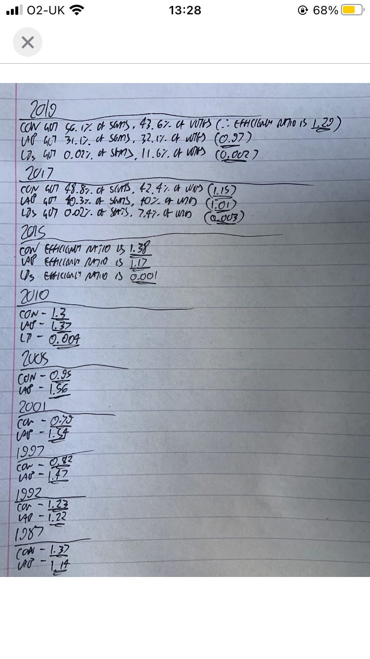 Here, you can see a marked decline in Labour’s efficiency ratio from 2015 onwards, under Corbyn. Whilst in 2017, Labour had its best result (in terms of vote share) since 2001, it was much less efficient at converting this into seats relative to 2001, and crucially, 2015.